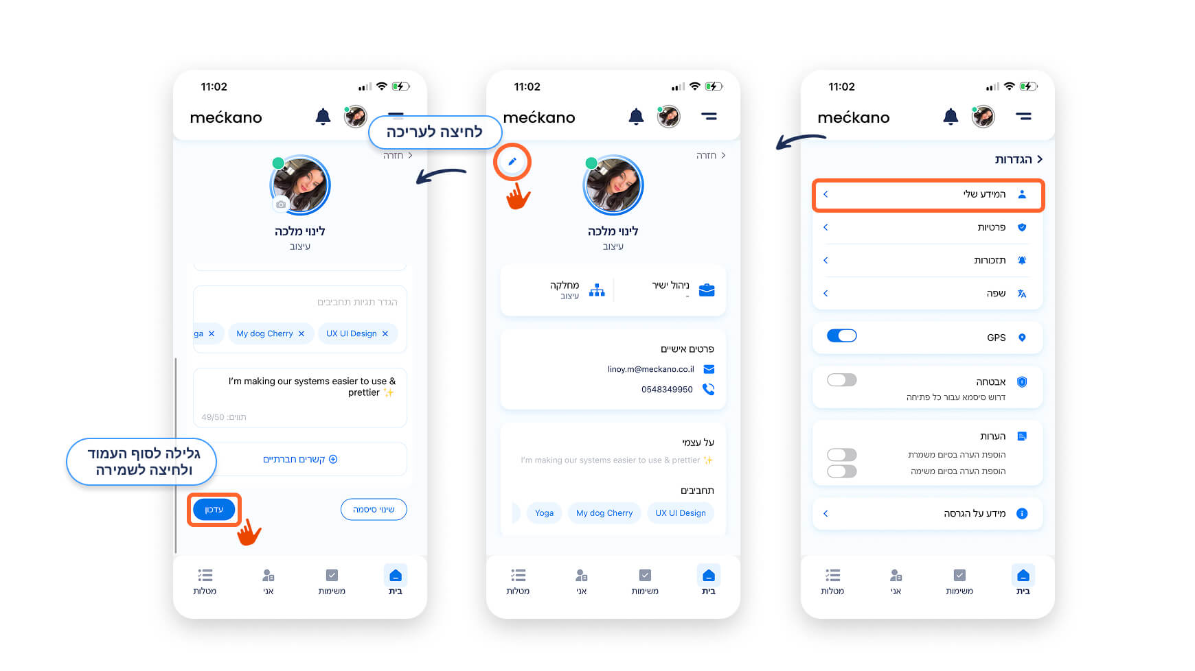 ניתן לעדכן את הפרטים ולהוסיף מידע נוסף (כמו תיאור קצר או קישורים לרשתות חברתיות) בלחיצה על אייקון העיפרון בפינה העליונה של המסך. בסיום העריכה, לחצו על עדכון בתחתית המסך.