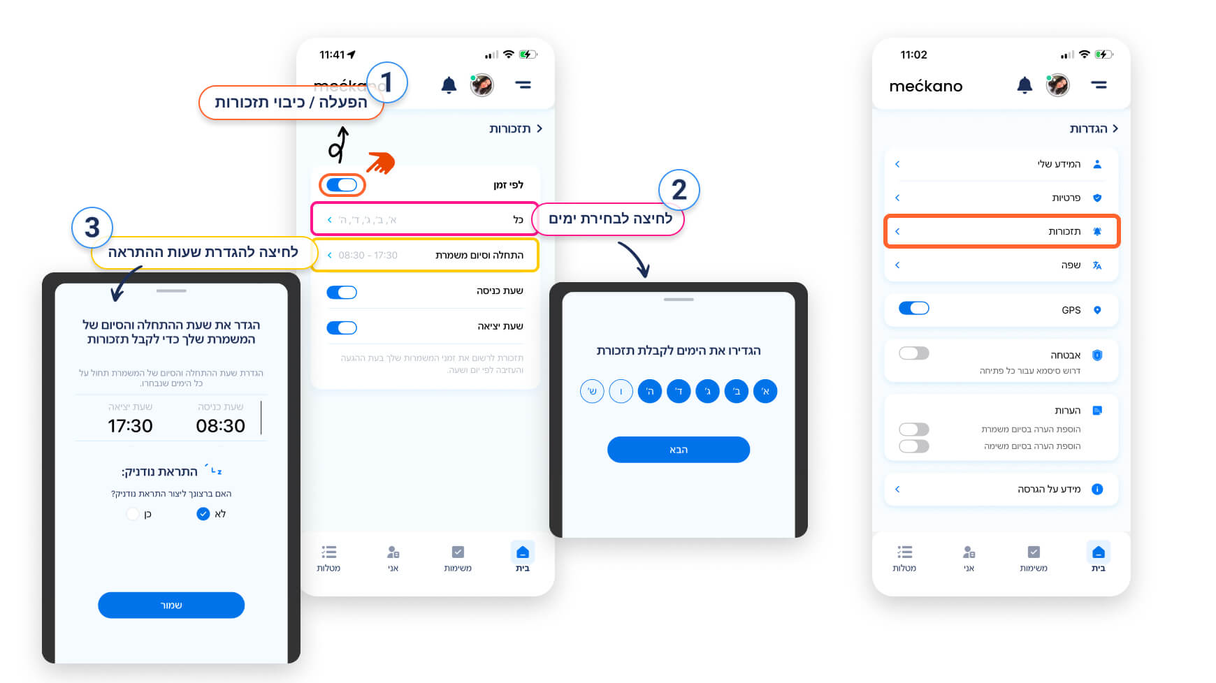 כאן תוכלו להגדיר תזכורות אישיות לתחילת וסיום משמרת. כדי להגדיר תזכורת: