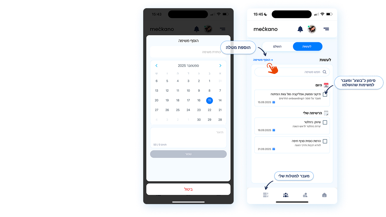 במסך זה תוכלו להוסיף מטלה חדשה , לסמן מטלה כהושלמה על ידי לחיצה בתיבת הסימון שלצדה ולצפות במטלות שהושלמו על ידי מעבר ללשונית “הושלמו”.