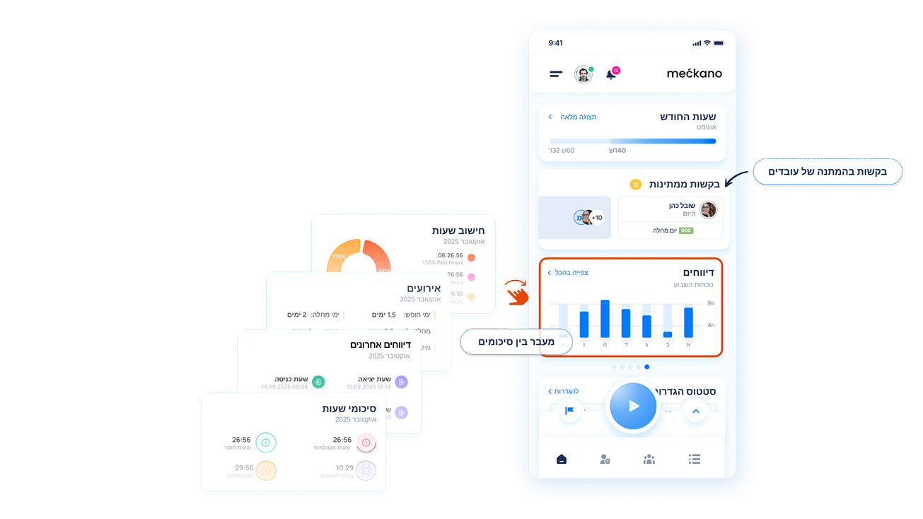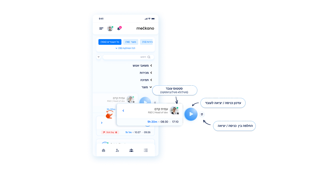 אפליקציית שעון נוכחות החדשה של meckano מציגה לראשונה גם גרסת מנהל, ומביאה את כל כלי הניהול החשובים ישירות לנייד שלכם. מעכשיו תוכלו לנהל את הצוות שלכם מכל מקום ובכל זמן: