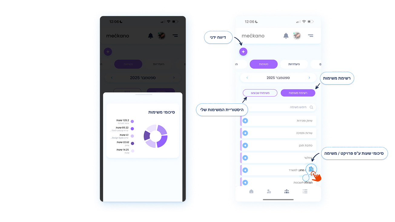 לשונית זו מרכזת את כל הפעילות שלכם הקשורה למשימות ופרויקטים. היא מאפשרת לכם לצפות בהיסטוריית הדיווחים המלאה שלכם, מסודרת לפי חודשים, ולקבל סיכומים מפורטים על חלוקת השעות. בנוסף, תוכלו להשתמש במסך זה כדי להוסיף דיווח חדש באופן ידני.